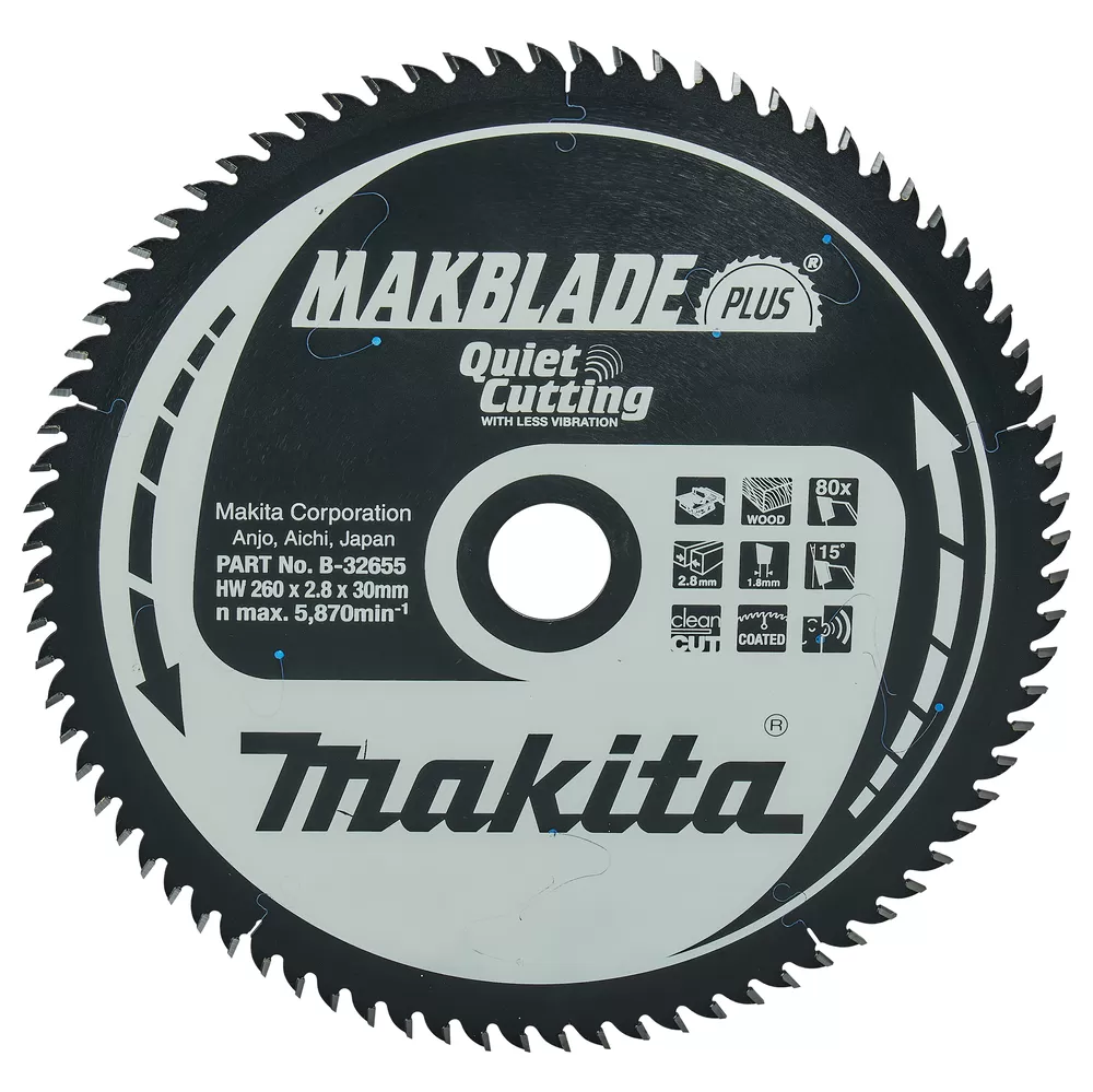 Prémiová řada pilových kotoučů pro řezání dřeva stolními pilami. Konstrukce kotoučů je upravená pro velmi tichý a čistý řez bez vibrací. MakBlade Plus je extrémně tichý, odolný 260mm pilový kotouč s 80 zuby s nízkými vibracemi pro řezání dřeva. Vhodné pro použití s pokosovými pilami a stolními pilami. Zářez je 2,8 mm a 30 mm trn.