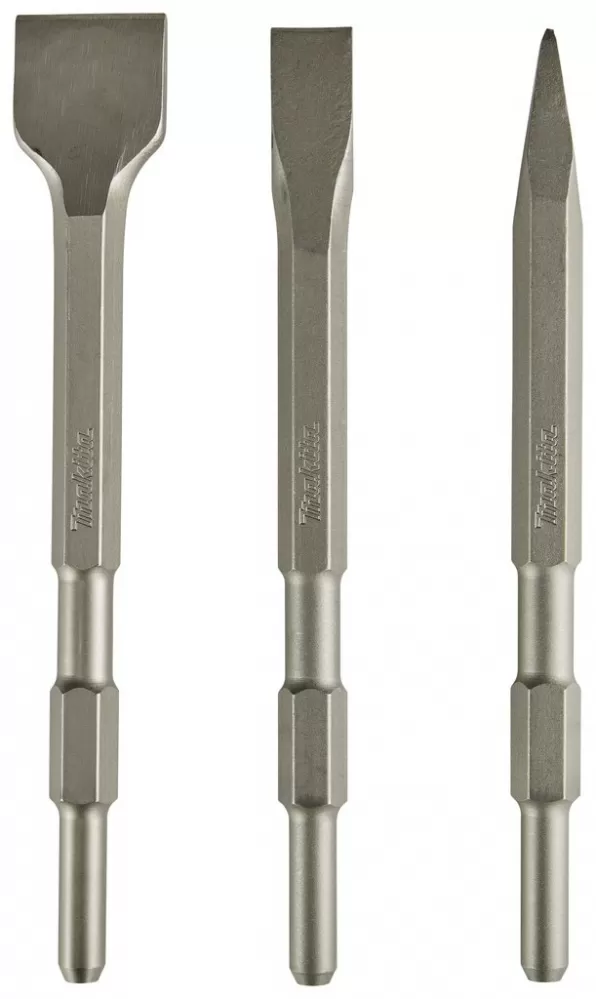 • Sada sekáčů 3 ks šestihran 17 mm v plastovém obalu. Sada obsahuje plochý sekáč 255 x 40 mm, plochý sekáč 255 x 20 mm a špičák 255 mm